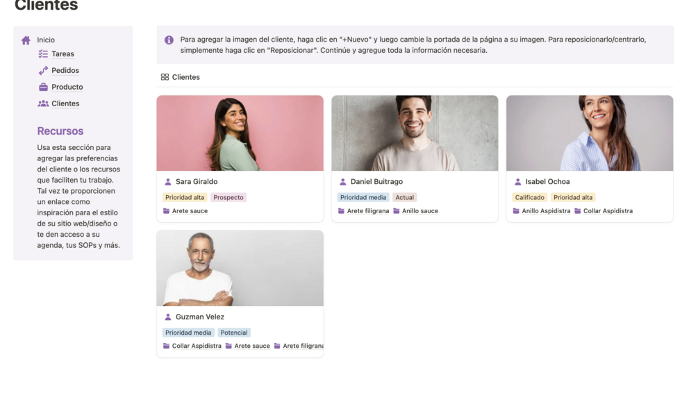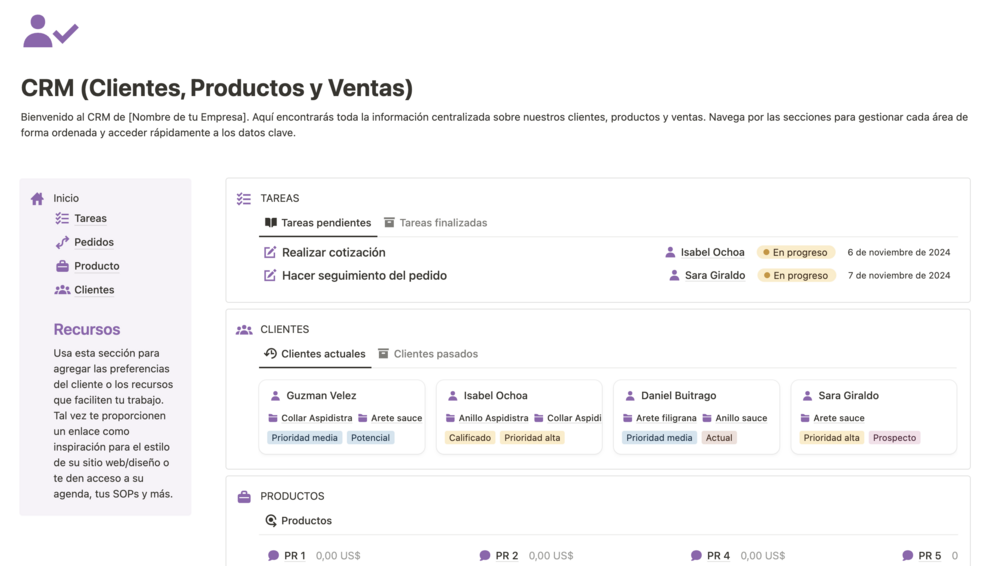 CRM (Clientes, Productos y Ventas) en Notion